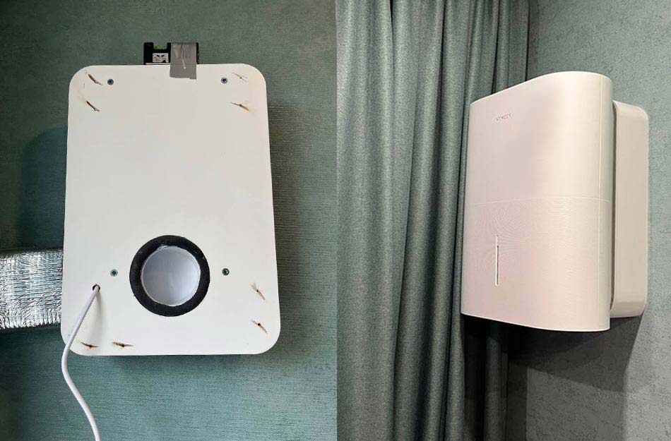 Можно установить после завершения ремонта. Монтаж бризера занимает 1,5–2 часа, необходимо пробурить одно отверстие в стене под воздуховод. Мусор, строительная пыль собираются специальной установкой, поэтому мебель и другие предметы интерьера не загрязняются.