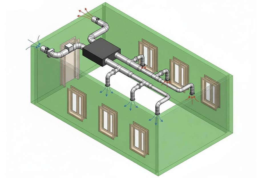Свежий воздух поступает одновременно во все помещения здания через разветвлённую сеть воздуховодов. Если вытяжная система работает эффективно, то воздухообмен в здании происходит равномерно, без застойных зон.
