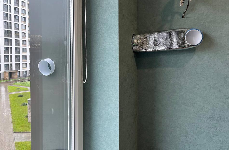Для монтажа необходимо пробурить отверстие в наружной стене и проложить внутри неё воздуховод. Разветвлённую сеть воздуховодов на фасаде или внутри помещения прокладывать не нужно.