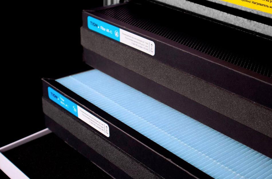 Система фильтров бризера Tion 4S. Снизу вверх: префильтр, HEPA-фильтр, угольный фильтр